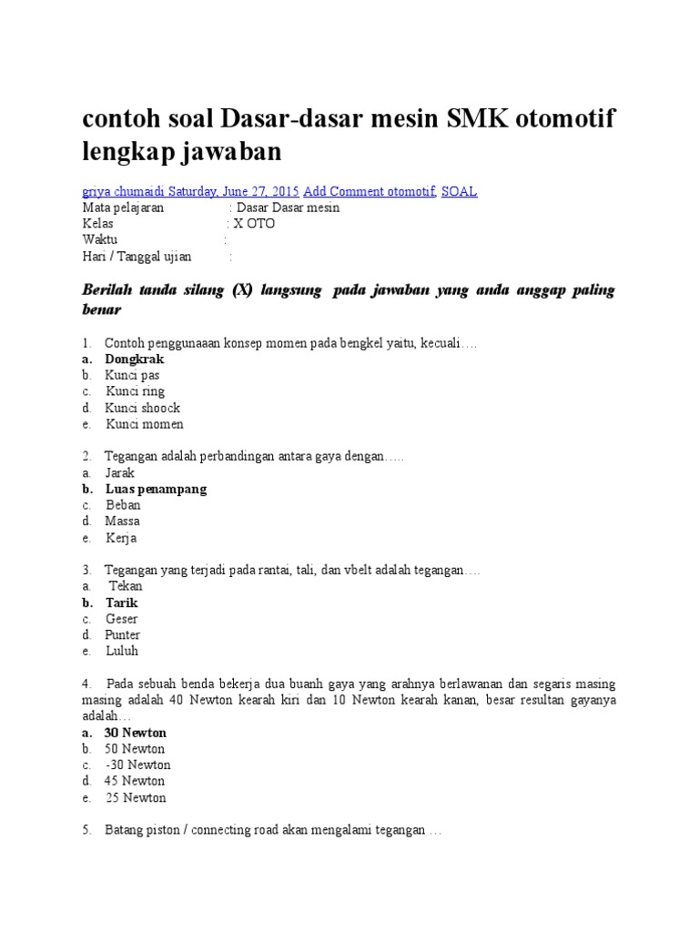Contoh Soal Teknik Dasar Otomotif Kelas 10 Beserta Jawabannya Dapatkan Contoh